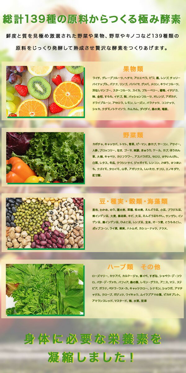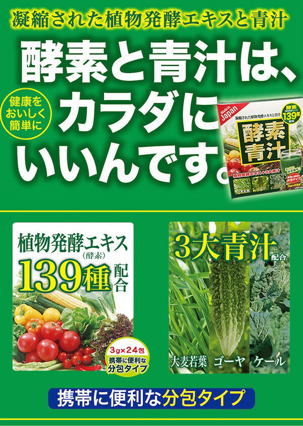 ■商品名 酵素青汁 ■サイズ・容量 内容量:3g×24包×3 ■生産地:日本 ■素材・成分:大麦若葉、ぶどう糖、ゴーヤ、ケール、植物発酵乾燥粉末(デキストリン、植物発酵乾燥粉末)、甘味料(ステビア)、(原材料の一部にオレンジ、キウイ、フルーツ、バナナ、リンゴ、大豆、ゴマ、カシューナッツを含む) ■パッケージ:化粧箱入り ■注意事項 賞味期限:3年 ■メーカー株式会社ヒロコーポレーション 『植物発酵・乾燥粉末139種』 大麦若葉、ぶどう糖、ゴーヤ、ケール、植物発酵乾燥粉末(デキストリン、植物発酵乾燥粉末)、甘味料(ステビア)、(原材料の一部にオレンジ、キウイフルーツ、バナナ、リンゴ、大豆、ゴマ、カシューナッツを含む) 『植物発酵・乾燥粉末139種』 昆布、わかめ、のり、ローズマリー、カツアバ、カルケージャ、紫イペ、すぎな、シャペウ・デ・コウロ、パタ・デ・ヴァカ、パフィア、レモン・グラス、アニス、マテ、ステビア、ガラナ、綿実、ペドラ・ウメ・カ、キャッツクロー、シナモン、ショウガ、ハトムギ、アガリクス、アマチャヅル、クローブ、ガジュツ、ウイキョウ、レンコン、ごぼう、玄米、オーツ麦、とうもろこし、大麦、えんどう豆、小豆、ブラジル豆、紫インゲン豆、黒胡麻、キビ、大豆、ポップコーン、ライ麦、黒インゲン豆、ひよこ豆、レンズ豆、オレンジ、パイナップル、バナナ、リンゴ、パパイヤ、グァバ、メロン、アボカド、ドライプルーン、アセロラ、レモン、レーズン、マンゴー、スターフルーツ、スイカ、カシューナッツ、パラナッツ、クダモノトケイソウ、キウイフルーツ、洋なし、さつまいも、しいたけ、チコリ、大根、キャベツ、ムイラプアマの葉、カムカム、ピカオプレト、カボチャ、キャッサバ、トマト、青菜、ピーマン、赤カブ、ヤーコン、アサイー、人参、ブロッコリー、なす、ゴーヤ、紫蘇、きゅうり、ケール、カブ、ほうれん草、ブルーベリー、葡萄、イチジク、柿、金柑、すもも、イチゴ、カリフラワー、アスパラガス、セロリ、さやいんげん、白菜、レタス、冬瓜、クウシンサイ、梨、エノキダケ、アマランスレッド、パッションフルーツ、ダイダイ、マスタード、桑の実、ジャガイモ、竜眼、梅、ココナッツ、紅甘藷、クズイモ、タロイモ、山芋、桑の葉、えんどう豆もやし、ライチ、グレープフルーツ、ヘチマ、アロエベラ、ビワ、桃、レンブ、チェリー、蓮の実、菜種、松の実、サンザシ、インゲン豆、シャカ、水栗、ナツメ、亜麻 ■【お召し上がり方】 1日1〜2包程度を目安に、水や牛乳などの飲み物によく混ぜてお召上がりください。