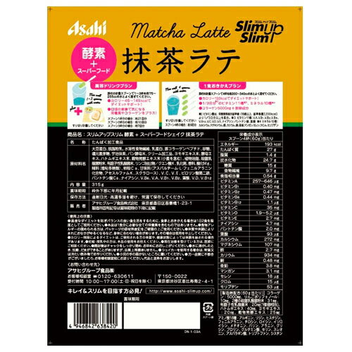原材料名・栄養成分等●名称:たんぱく加工食品●原材料名:大豆蛋白、脱脂粉乳、水溶性食物繊維、乳蛋白、豚コラーゲンペプチド、砂糖、還元麦芽糖、宇治抹茶、パン酵母末、クリーム加工品、ヨモギエキス末、酵母エキス、ハトムギエキス末、穀物発酵エキス末(小麦を含む)、植物油脂、殺菌乳酸菌粉末、有胞子性乳酸菌末、リンゴ抽出物/クエン酸K、乳化剤、香料、酸化Mg、糊料(増粘多糖類)、卵殻Ca、甘味料(アスパルテーム・L-フェニルアラニン化合物、アセスルファムK、スクラロース)、V.C、V.E、ピロリン酸第二鉄、パントテン酸Ca、ナイアシン、V.B6、V.A、V.B1、V.B2、葉酸、V.D、V.B12 ●栄養成分表示:スプーン4杯(60g)エネルギー193kcal、たんぱく質27g、脂質1.4g、炭水化物24.7g(糖質15g、食物繊維9.7g)、食塩相当量0.54g、ビタミンA 257-646μg、ビタミンB1 0.40mg、ビタミンB2 0.47mg、ビタミンB6 0.44mg、ビタミンB12 1.1μg、ビタミンC 35mg、ビタミンD 1.9-5.2μg、ビタミンE 2.7mg、ナイアシン 4.7mg、パントテン酸 2.0mg、葉酸 93μg、カルシウム 272μg、マグネシウム 107mg、鉄 2.7mg、カリウム 934mg、銅 0.48mg、亜鉛 3.8mg、マンガン 3.1mg、セレン 18μg、クロム15μg、モリブデン 53μg【製造時配合(60g)当たり】コラーゲン:5000mg、リンゴポリフェノール:10?、2種の殺菌乳酸菌粉末:31mg、有胞子性乳酸菌末:20?(1億個相当)、ハトムギエキス:40?、ヨモギエキス:20?、穀物発酵エキス:25mg原産国日本お問い合わせ先アサヒグループ食品株式会社0120-63061110:00-17:00(土・日・祝日を除く)ブランド:スリムアップスリム楽天24>健康食品>ダイエットサポート>ダイエットフード>ダイエットシェイク>スリムアップスリム 酵素+スーパーフードシェイク 抹茶ラテ 315g販売元:アサヒグループ食品原産国 日本内容量:315gJANコード: 4946842638420賞味期限等の表記について「西暦年/月/日」の順番でパッケージに記載。