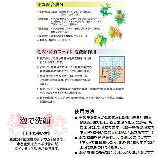 商品名 セラミド洗顔パウダー(酵素入) 内容量 80g 商品説明 3種の酵素成分(*)が肌をやわらげ古い角質・毛穴の汚れなどを落とし皮膚を清浄にします。