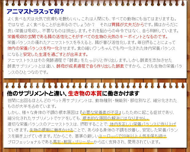 スイス生まれの100%天然サプリメント アニマストラス 50年以上世界20か国で愛され続けています ■原材料 原形質分離したハーブ酵母 麦芽エキス はちみつ オレンジジュース ■内容量 100ml ■湿気や直射日光を避け、涼しいところに保存してください。